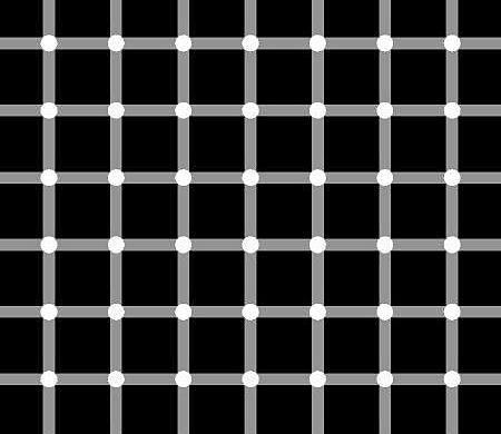 A grade de Hermann modificada. Embora a luminância das faixas claras seja uniforme, e os círculos pequenos sejam originalmente brancos, há uma tendência em enxergá-los escurecidos quando os mesmos se afastam da mácula. Supõe-se que as manchas cinzentas resultem da atividade no nível das células ganglionares retinianas com organização de campo receptivo antagônico centro-periférico. Em outras palavras, os sentidos são ativados por processos de excitação/inibição e, quando os contrastes são muito fortes em uma pequena área observada, algumas limitações sensitivas se tornam evidentes.