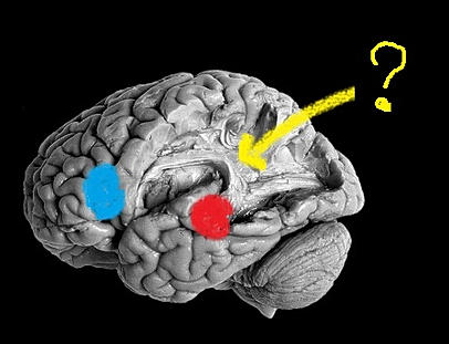 Uma das formas de comunicação, a comunicação verbal depende de uma boa integração entre regiões cerebrais específicas. A área em vermelho (Wernicke) processa a informação recebida; a azul (Broca) elabora a resposta verbal. Em amarelo, os feixes neurais que as integram.